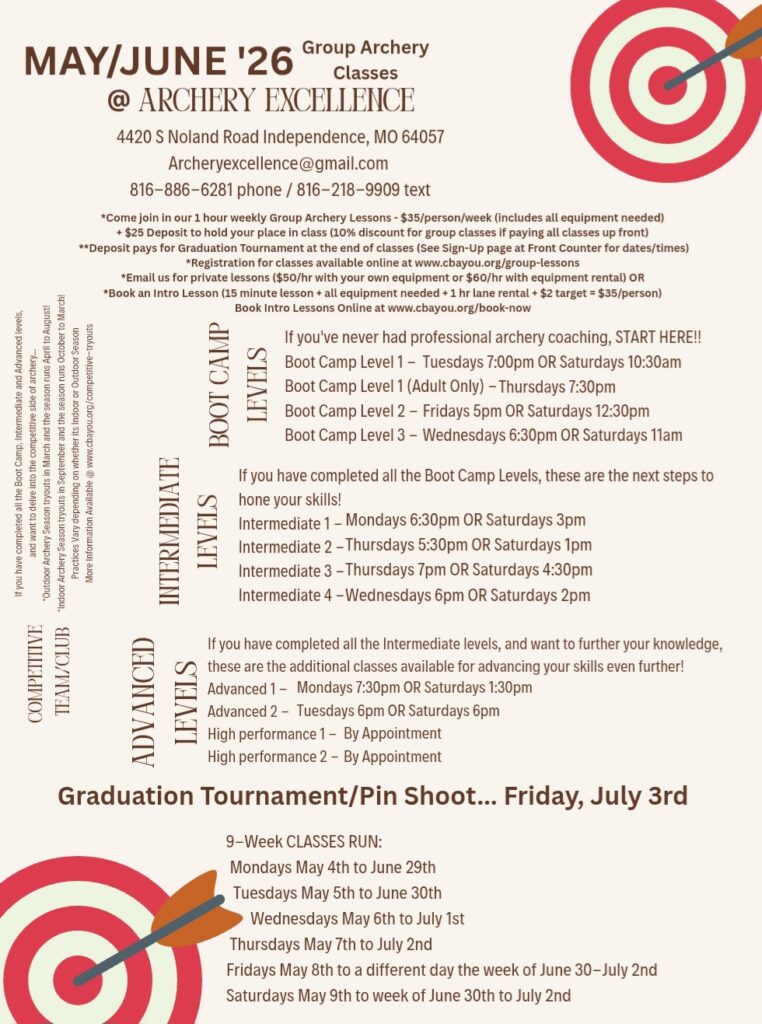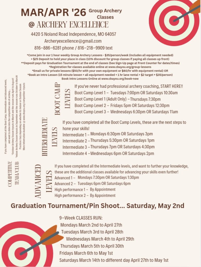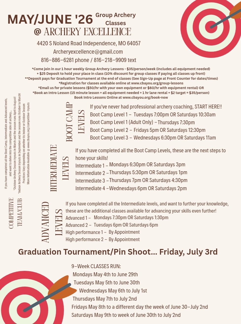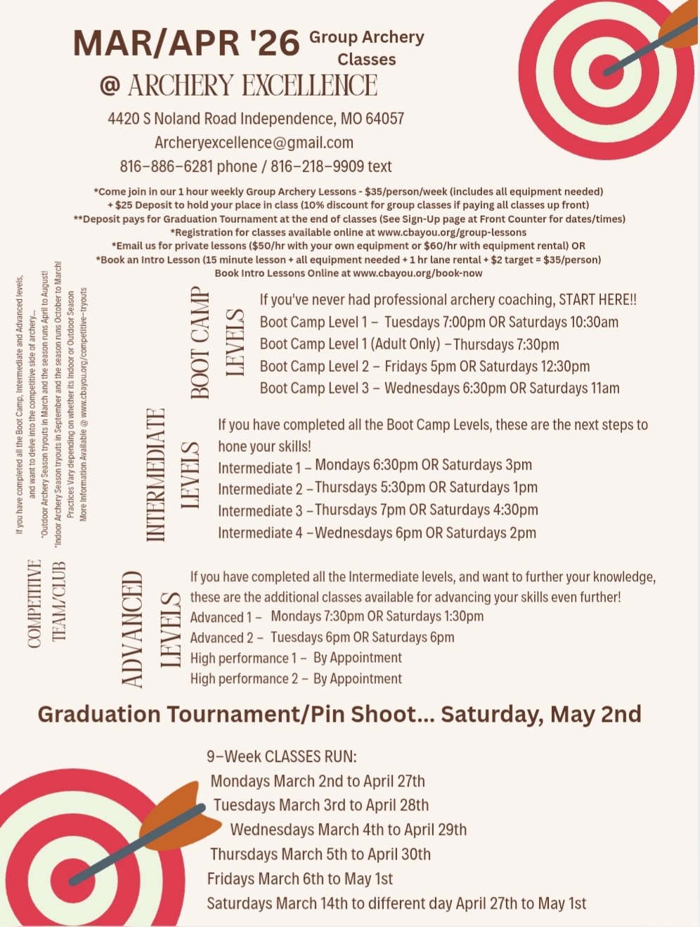 You can Reserve your spot by clicking the “Book Online” button at the top of the page or calling in (816-886-6281 or 816-325-3517) or texting (816-218-9909) or emailing (archeryexcellence@gmail.com) *********************