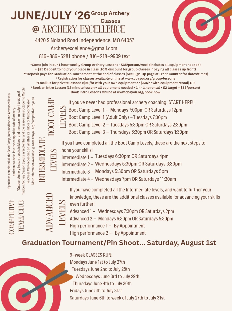 Private lessons are limited and available by reservation only (email archeryexcellence@gmail.com or text 816-218-9909 with possible dates day/time possibilities that work with your schedule and we’ll check our schedule for availability)!